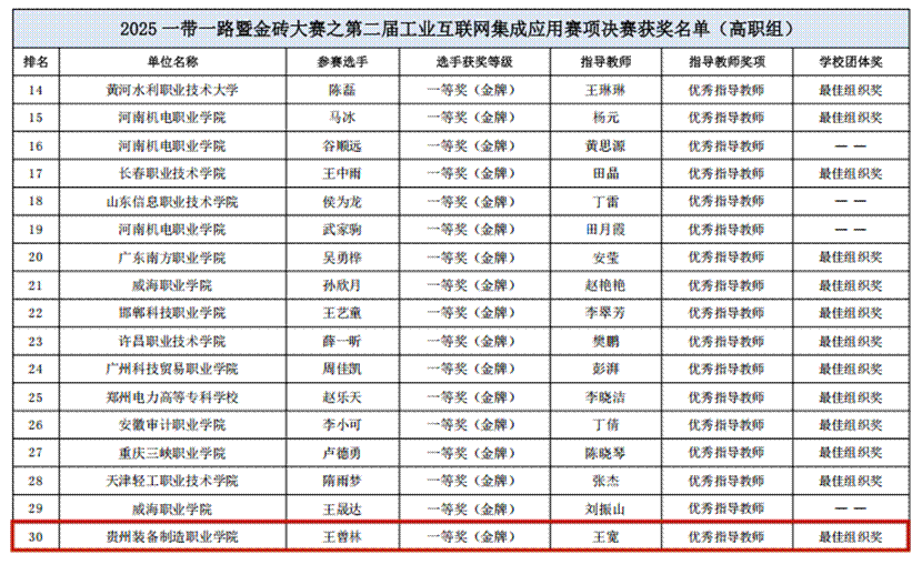2025年9月14日,2025年一带一路暨金砖国家技能发展与技术创新大赛工业互联网集成应用赛项(赛项编号:BRICS2025-ST-050)成功举办。我校机械工程系师生组队参赛,斩获多项荣誉。工业互联网应用专业学生王曾林获高职组一等奖(金牌),指导教师王宽获优秀指导教师称号,工业互联网应用教师田茂鑫、王宽分别获教师组二等奖(银牌),贵州装备制造职业学院获最佳组织奖,实现学生、教师、集体三类荣誉全覆盖,充分彰显我校工业互联网应用专业的育人实力。