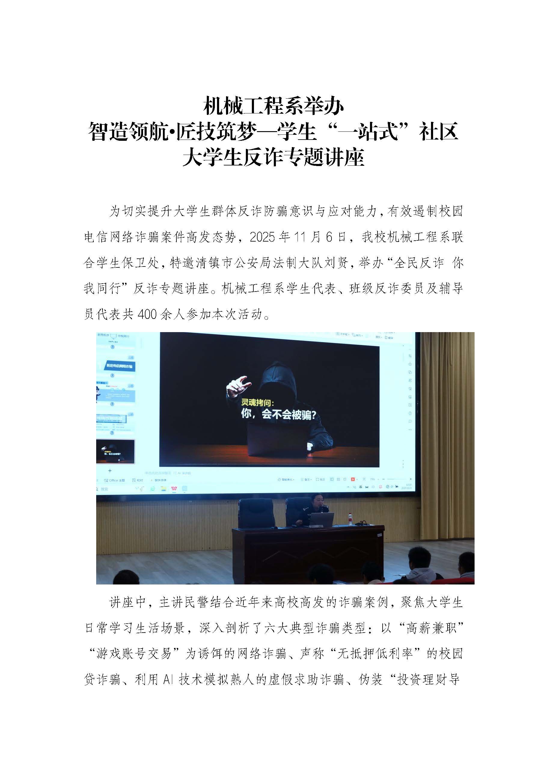 机械工程系举办智造领航•匠技筑梦—学生“一站式”社区 大学生反诈专题讲座
