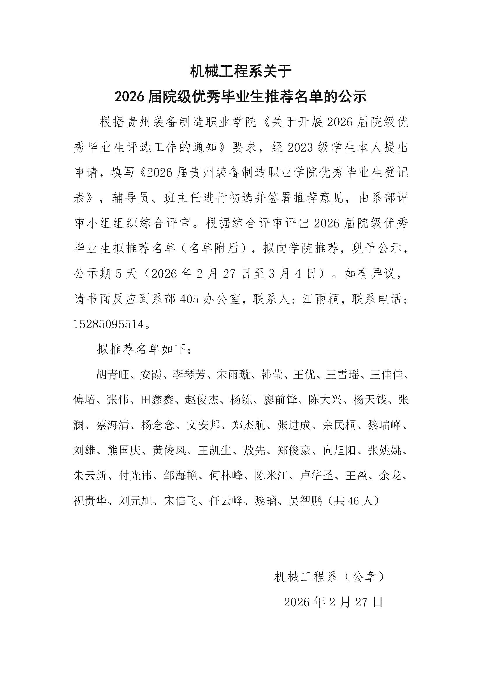 机械工程系关于 2026届院级优秀毕业生推荐名单的公示