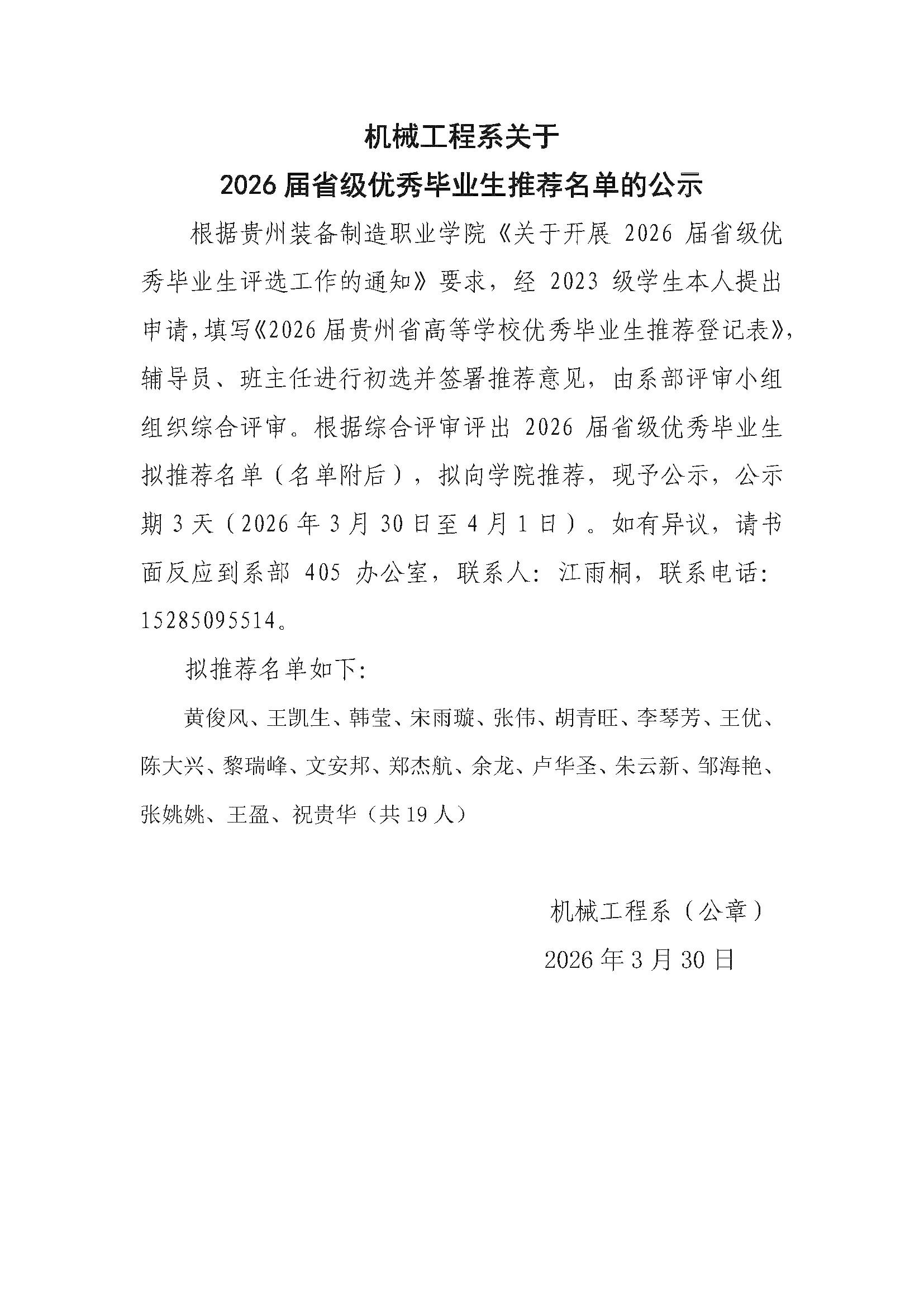 机械工程系关于 2026届省级优秀毕业生推荐名单的公示
