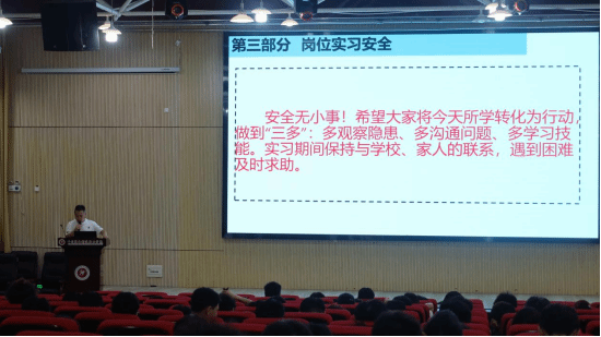 一、岗位实习安全与实践指引。此板块将安全问题作为核心前置强调,主讲人重点明确岗位实习中的三大安全要点——操作安全,需严格遵守实习单位设备操作规程,杜绝违规操作;人身安全,提醒学生注意通勤、住宿及外出期间的交通安全与财产保护,避免前往陌生危险区域;信息安全,严禁泄露实习单位商业机密与技术资料,同时保护个人身份信息不被滥用。在安全基础上,进一步明确实习任务与考核标准,强调实习经历对专业实践能力提升的核心价值,为学生安全、高效对接实践岗位提供全面指引。